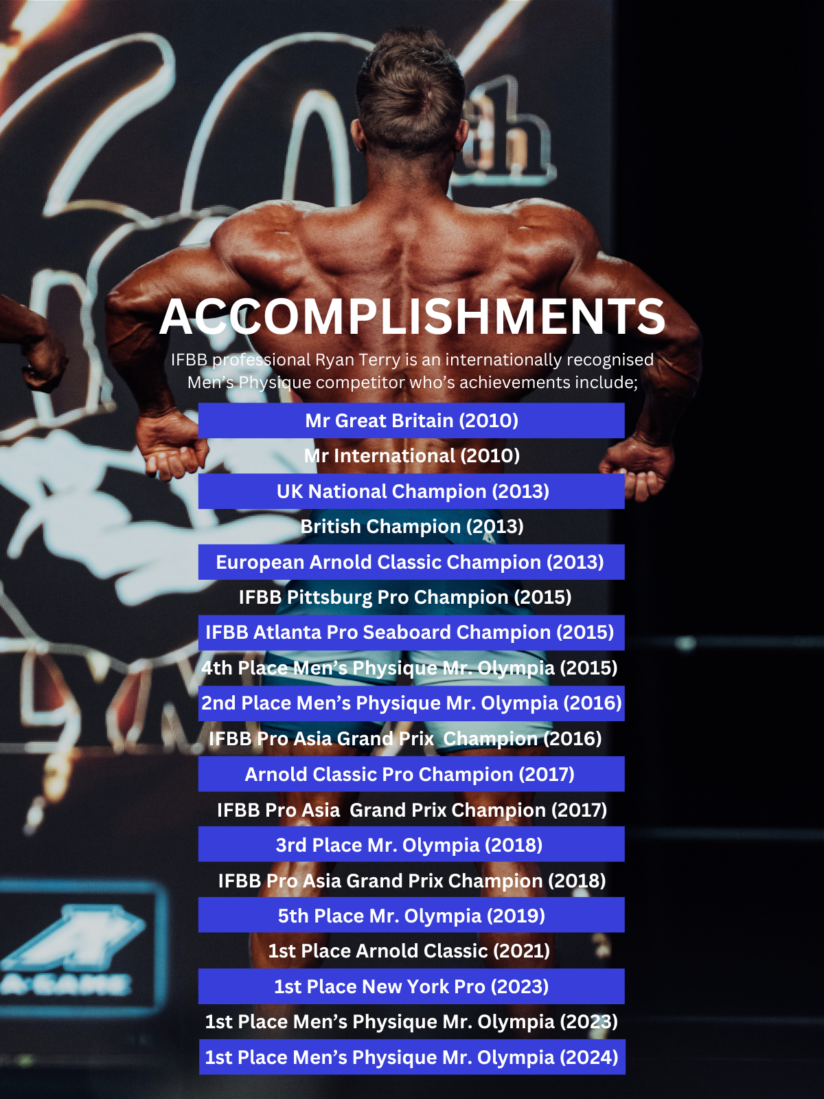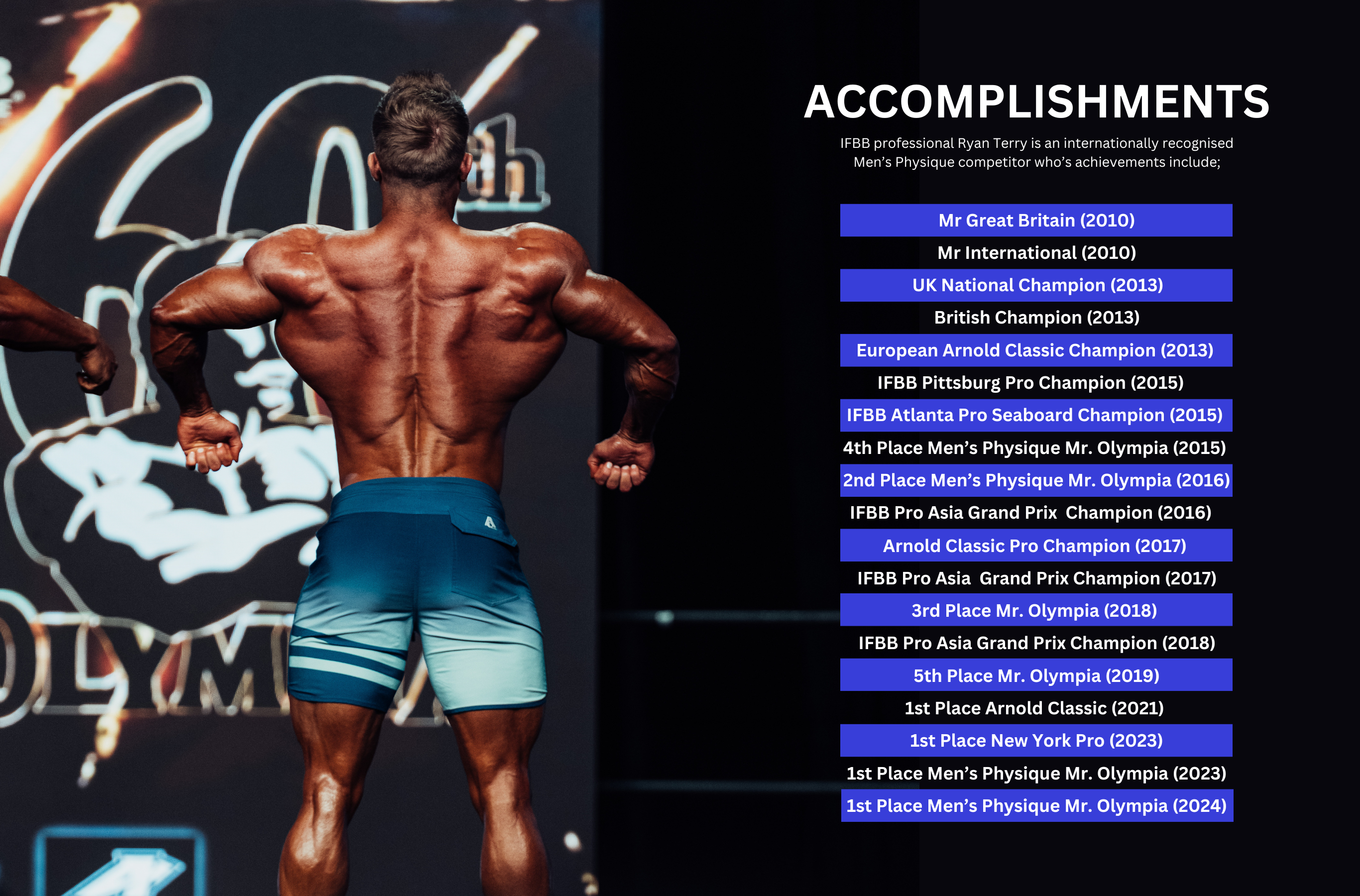 Ryan Terry is a multi-faceted entrepreneur and 2x Mr Olympia Men’s Physique Champion. As the CEO of RT FITRT Eats, and RT Coaching, Ryan combines his passion for fitness and business to inspire and guide others. From his beginnings as a plumber in Worksop, Nottinghamshire, to becoming one of the world’s top physique athletes, Ryan’s journey is a testament to hard work and dedication.